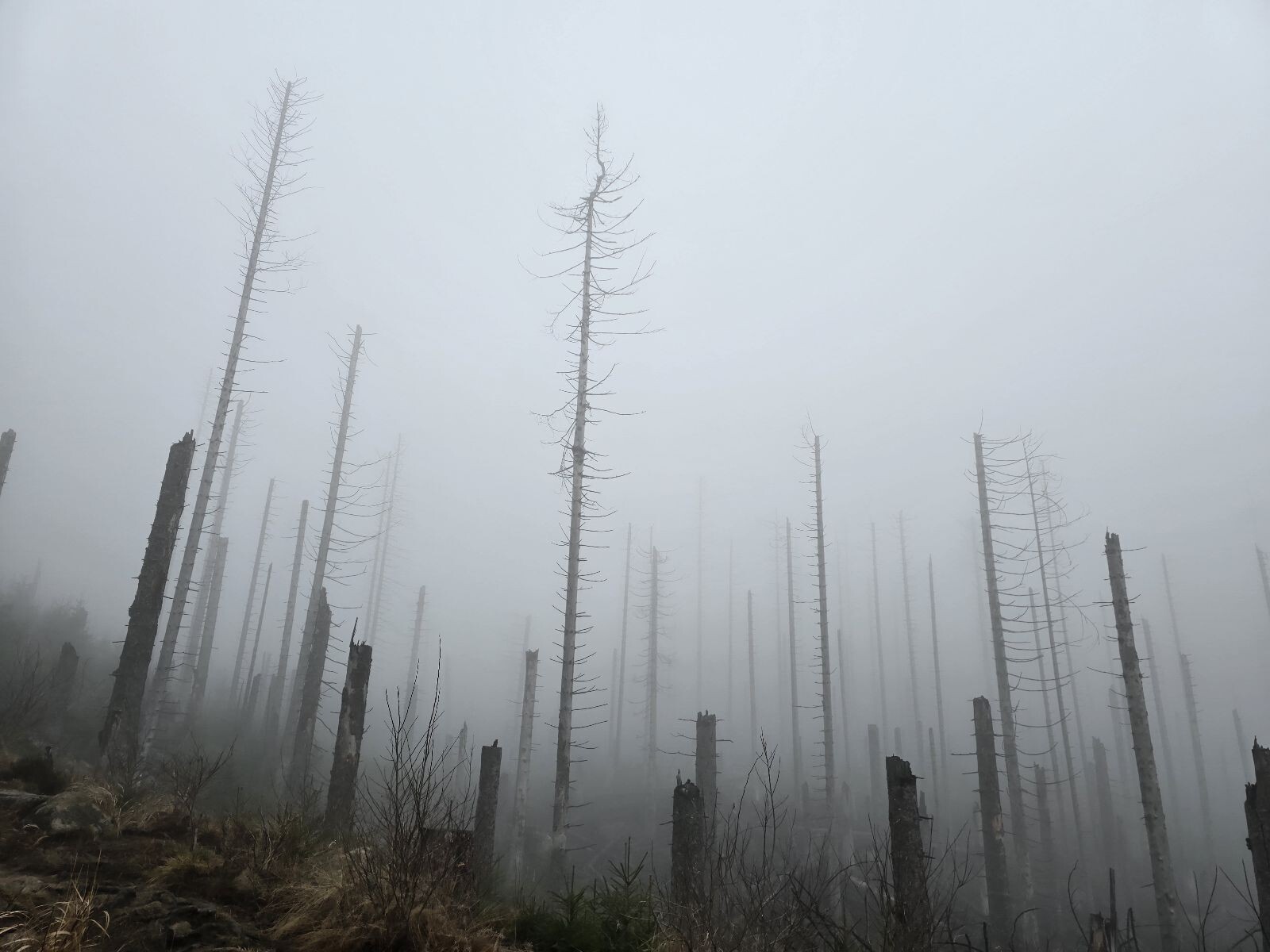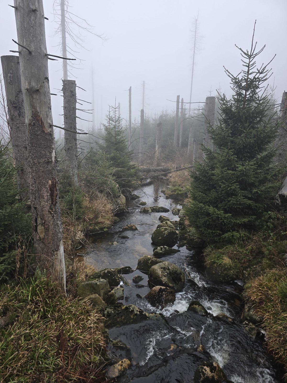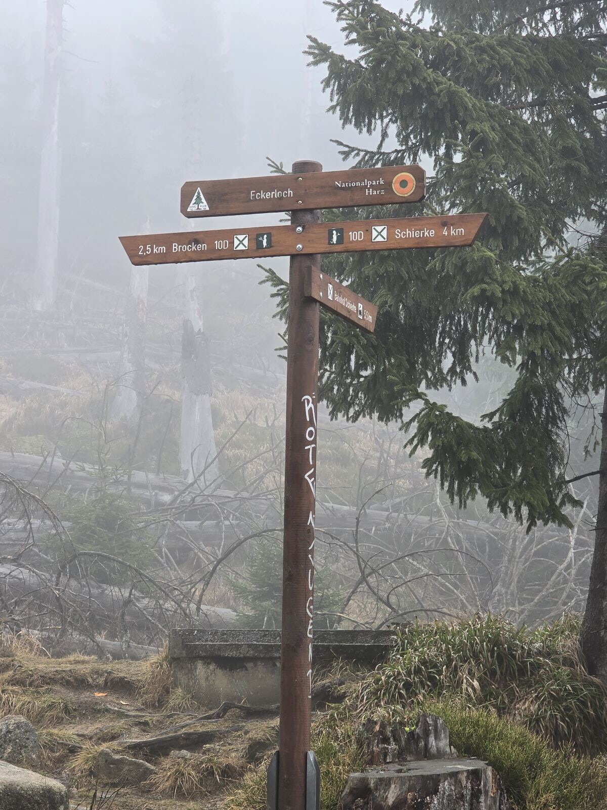 In het donker naar de top van de Brocken om de zonsopkomst te zien. Helaas te mistig, dus geen uitzicht. Via de moeilijke maar gave Echerlockstieg weer terug naar Schierke.